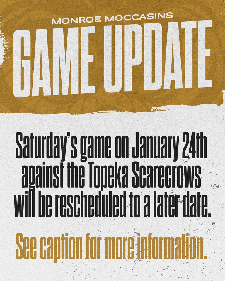 Saturdays game on January 24th vs. Topeka will be rescheduled to a later date. Tickets for the game on the 24th will be valid for the rescheduled date.